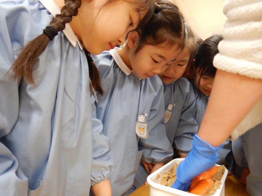 2025.01.27 年長組☆お野菜を漬けました! 全学年共通 日本のキラキラプロジェクトの一環で、今日はぬか漬けに挑戦しました。 12月の保育参観でしめ縄風リースを作成した際に、玄米を精米機にかけた後にできる「ぬか」を使って3学期にぬか漬けを作ろうねと、お話ししましたね! 子ども達に、どんなお野菜を漬けようか??と問いかけた結果 きゅうりと、にんじんに決定しました!! ぬかの匂いは少し苦手だったようですが、お漬物になるのをとっても楽しみにしている子ども達。 今週のどこかで食べられると思うのでお楽しみに☆ ギャラリー
