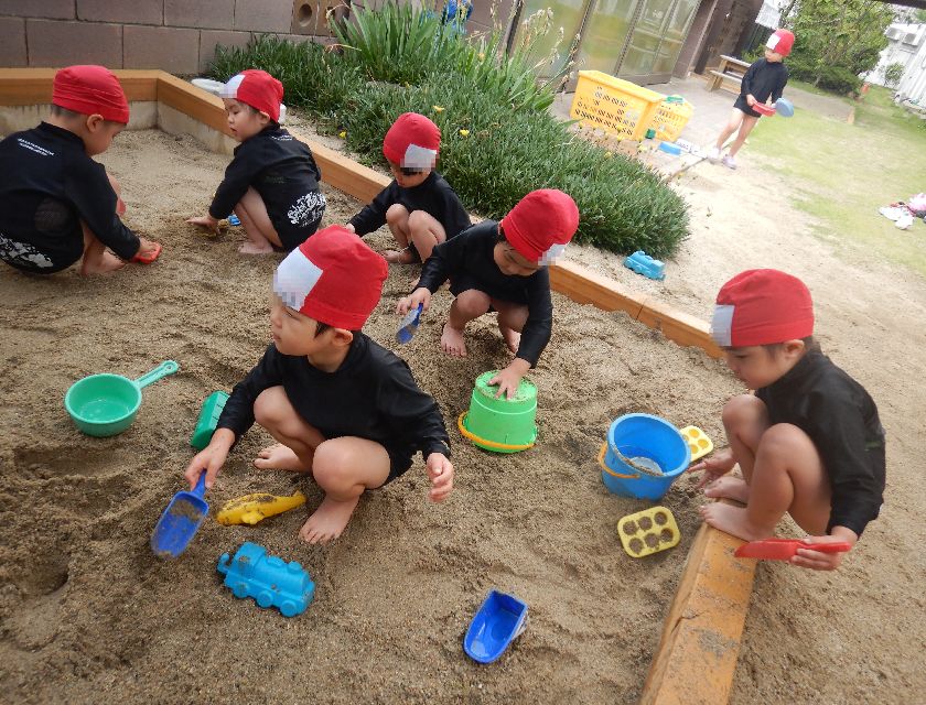 子ども達は、今までジャブジャブ遊びをしていたので、「泥んこ?」と砂場に水着を着て向かう事に不思議そうにしていました。