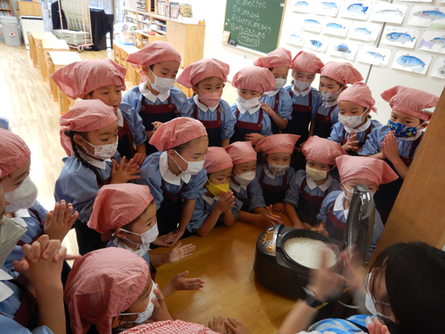 2023.11.28 日本のキラキラプロジェクト☆新米おにぎり 全学年共通 日本のキラキラプロジェクトで取り組んでいる「お米」。 本日は収穫し精米したお米で「新米おにぎり」に挑戦です! なんと本日は10合のお米を各クラスで炊きました。 お米の量り方、研ぎ方、水の量など自分達で取り組みました。 炊飯器からでる湯気の香り、炊き上がりのお米の艶やふっくら感などを存分に楽しみました♪ 自分で作ったおにぎりは格別に美味しかったようです! もう自分でお米を炊いておにぎりも作れますよ!! 出来ることがまた1つ増えました。おめでとう♪ ギャラリー