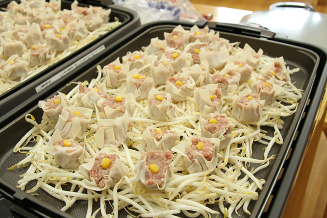 しゅうまいクッキングで、子どもたちに大好評だったレシピをご紹介します。しゅうまい、もやしをホットプレートで一気に蒸し上げて作りました。ご家庭でも、しゅうまい作りを楽しんでみてはいかがでしょうか(^-^)