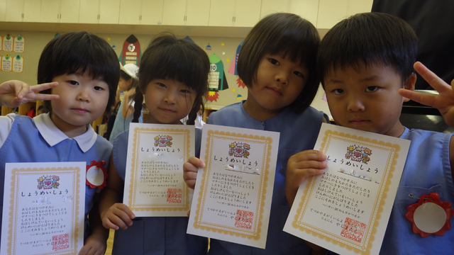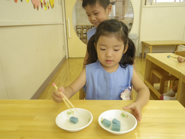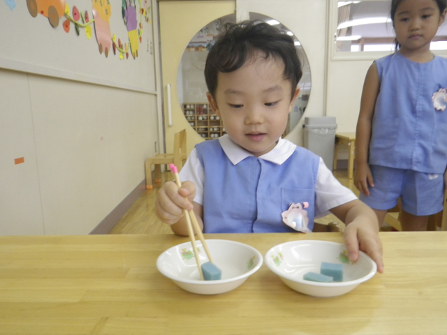 夏休みの宿題として、お箸の持ち方・扱い方・食事のマナーをご家庭でがんばっていただきました。 その成果はいかに?! ということで、先週と今週、お箸検定を実施しました。