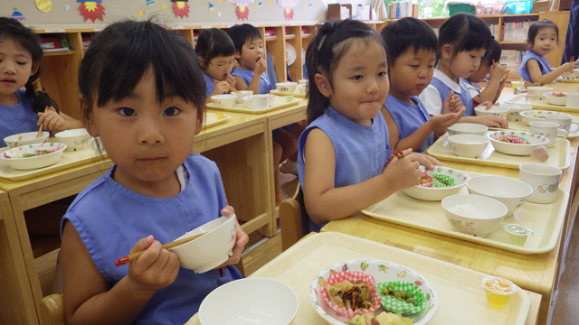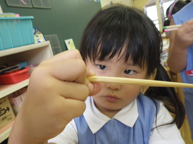 みんな、お箸の「持ち方」は随分と美しくなりました!!! すごい、すごい。 正しく持ったお箸を…さあ、動かしましょう…の段階にくると、あやしくなってきます。 でも、今はできなくても大丈夫。 この調子で毎回の食事の時に意識をしてお箸を扱うようにすると、必ずできるようになります。 幼稚園では給食の時に、みんなで一緒にがんばりましょうね。
