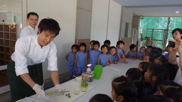 2014.07.25 本格スィーツ 全学年共通 年長さんのお泊り保育のために、帝塚山中2丁目のプリュスプリュスさんが出張してきてくださいました。 こどもたちの目の前で、デザートの仕上げをしてくださいました。 なんとも涼やかなマスカットゼリー。 100個食べられる!! パティシエになりたくなった子どもが増えたようです。 ギャラリー