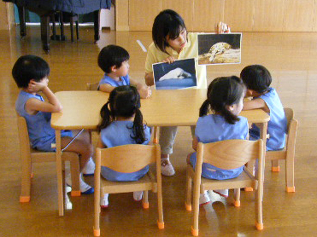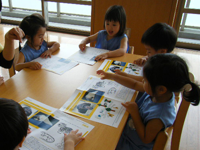 「ペンギンさんはどんなところにいたかな?」「ゾウさんは?」などという質問に、「冷たいところ」「木があるところ」などと、積極的にお話をしてくれました。「なぜ、冷たいところにいる動物さんや、木が生えているところにいる動物さんが一緒に住んでいるのかな。」という質問にも、子どもたちは興味津々でいろいろと考えている様子でした。このような会話を通じ、動物園は人工的に作られた環境で、動物たちのお世話をする飼育員さんがいることを学びました。