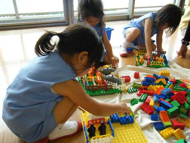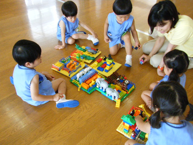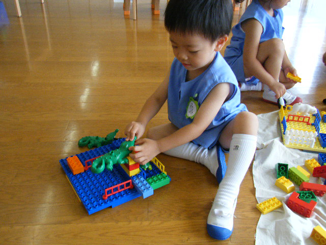 まずは、飼育員役のお人形を使って餌をあげたり、檻の中をお掃除してあげたり、健康チェックをしたりして楽しみました。このようにお世話することを楽しみながら、動物への興味関心を広げ、理解を深めることができました。また、一人一つずつお人形を持って、インストラクターが指定した動物のところへお人形を連れて行く遊びもしました。このような遊びを通じ、お話を聞く姿勢やルールを守る社会性を育むこともレゴスクールの教育のひとつです。