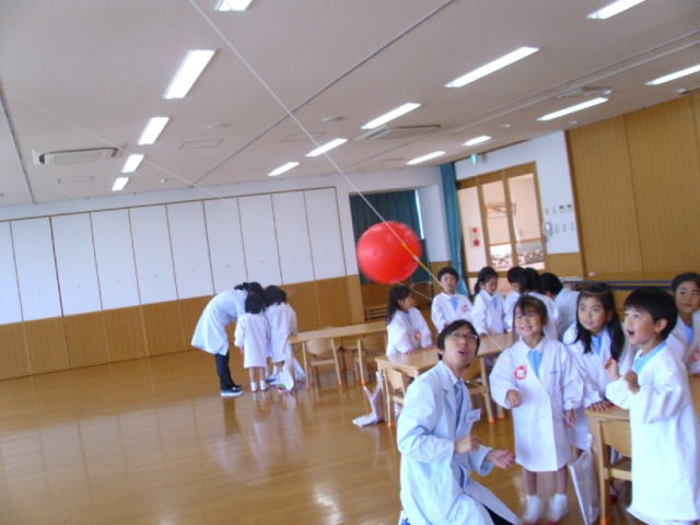 そして風船ロープウェーという実験もしました。膨らませた風船をロープにつけて風船の口を放すと・・・・ピューと空気を出しながらロープをのぼっていきます。上まで届くようにみんなで願いを込めながら飛ばしました。