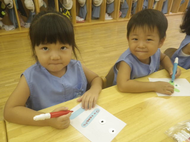 毎日げんきいっぱいの年少組さん。みんなでお歌をうたったり、作ったり描いたりすることも大好きです(^-^) 今日は、みんなのお気に入りの「♪とんぼのめがね」のお歌に似合う、とんぼめがねととんぼ飛行機を作ってあそんでみました。「赤色めがねがいい!!」「ぴかぴかめがねの黄色にする!!」など、それぞれに楽しんで作った子どもたちのめがねは、どれもステキに仕上がりましたね。みんなとてもかわいいめがねでした(^-^)そして、ストローを使って作ったとんぼ飛行機もお庭でよく飛んでいました。さわやかな秋空の下、たくさんあそぶことができて、うれしかったですね☆