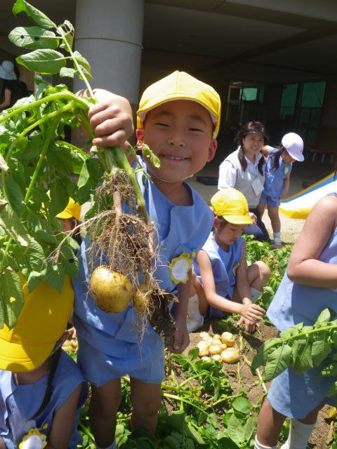 2013.05.23 新ジャガ!! 全学年共通 本日、年長組はじゃがいも掘りをしました。 このじゃがいもは、年中組の 2月に植えた「きたあかり」。 大豊作です!! 土の中からでてきたじゃがいもを見て、みんなびっくり。 大きいお芋や小さいお芋がザクザクでてきました。 今日、年長組はお土産を持って帰りました。お家でどんなお料理をしてもらうのかしら… たのしみですね☆ まだまだお芋は幼稚園にあります。 幼稚園でまた おいしいじゃがいもを食べましょうね! ギャラリー