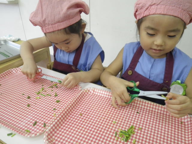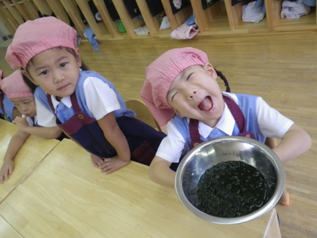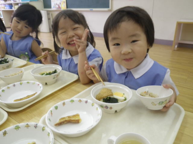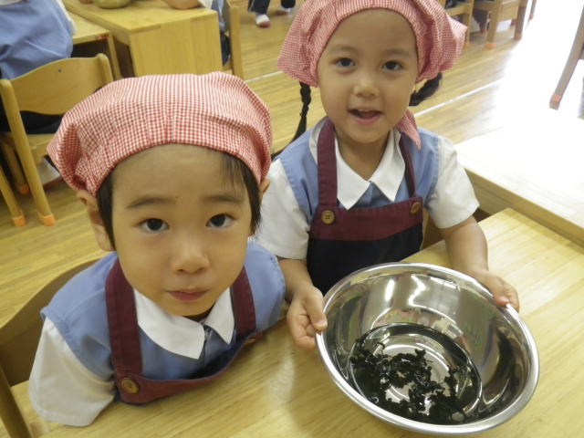 2012.10.05 つるつるっ!おうどんクッキング ~年少組~ 全学年共通 今日はクッキング、クッキング、ら・ら・ら♪ みんなで作ったのは、おうどん。 お給食では、なかなか麺類を食べることができないので、 えいっと作っちゃいました。 今回はおうどんの具材を各学年で担当してみましたよ。 年少児はわかめとお葱。 年中児は焼もち。 年長児はあげとゆでたまご。 自分達も食べるけれど、他のクラスのお友達にも食べてもらうのだから、美味しくてキレイに作らなくちゃね。 失敗は許されません~。 少々の気合を入れて、クッキングをいたしました。 ギャラリー