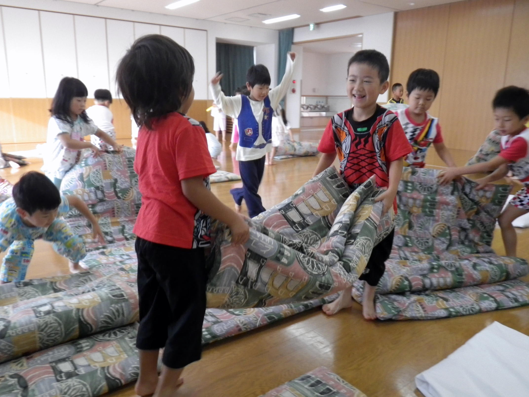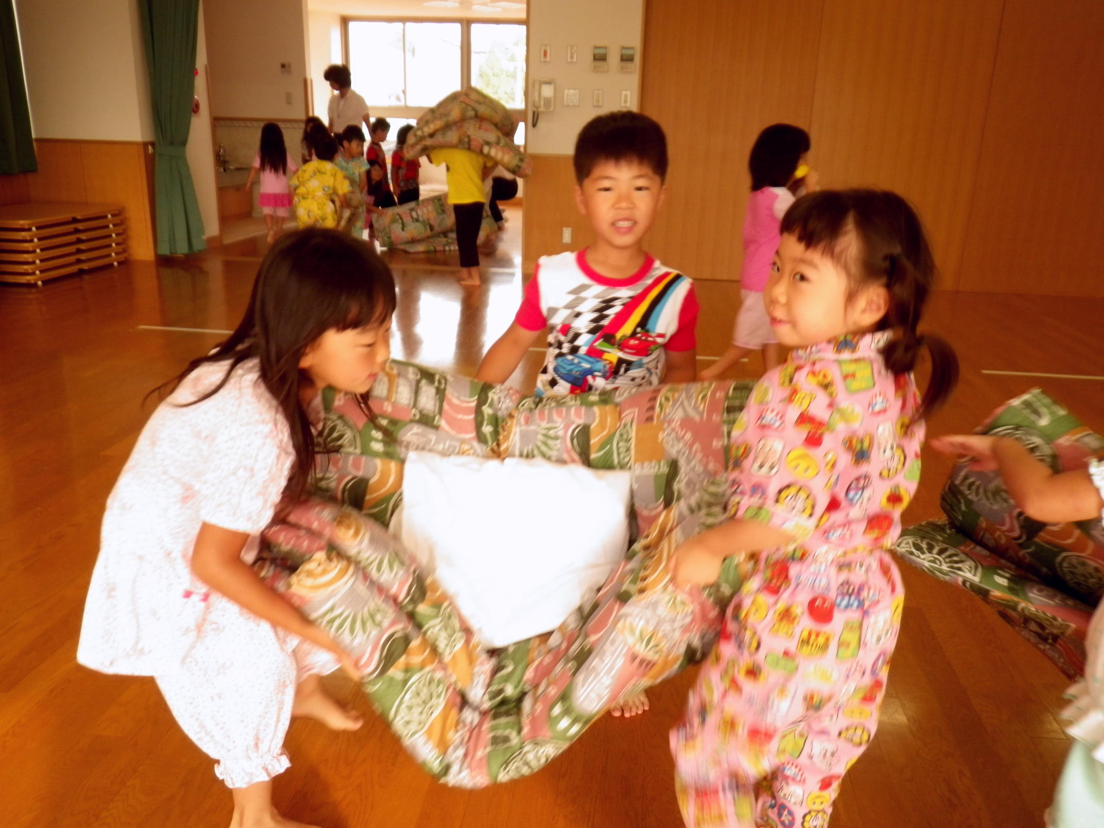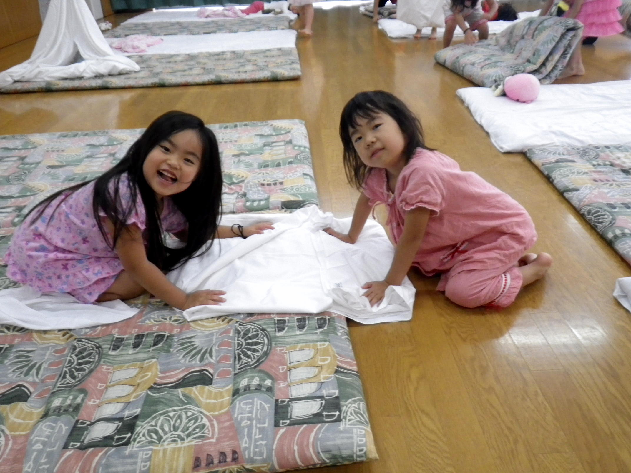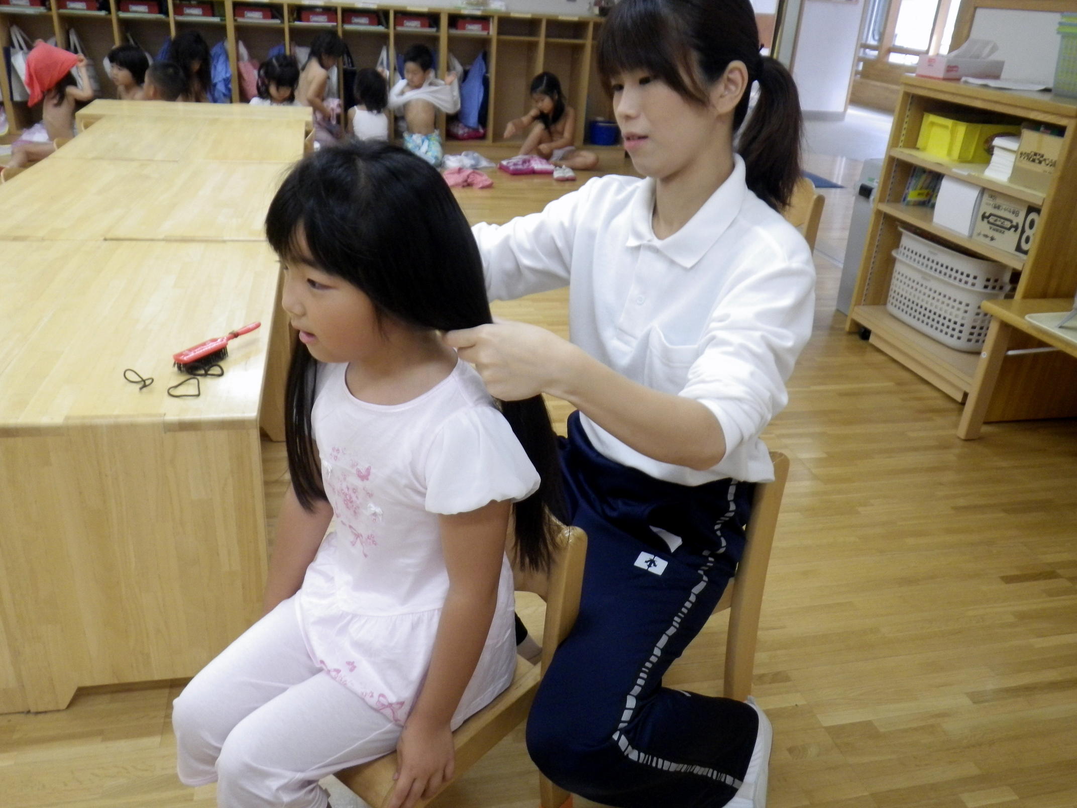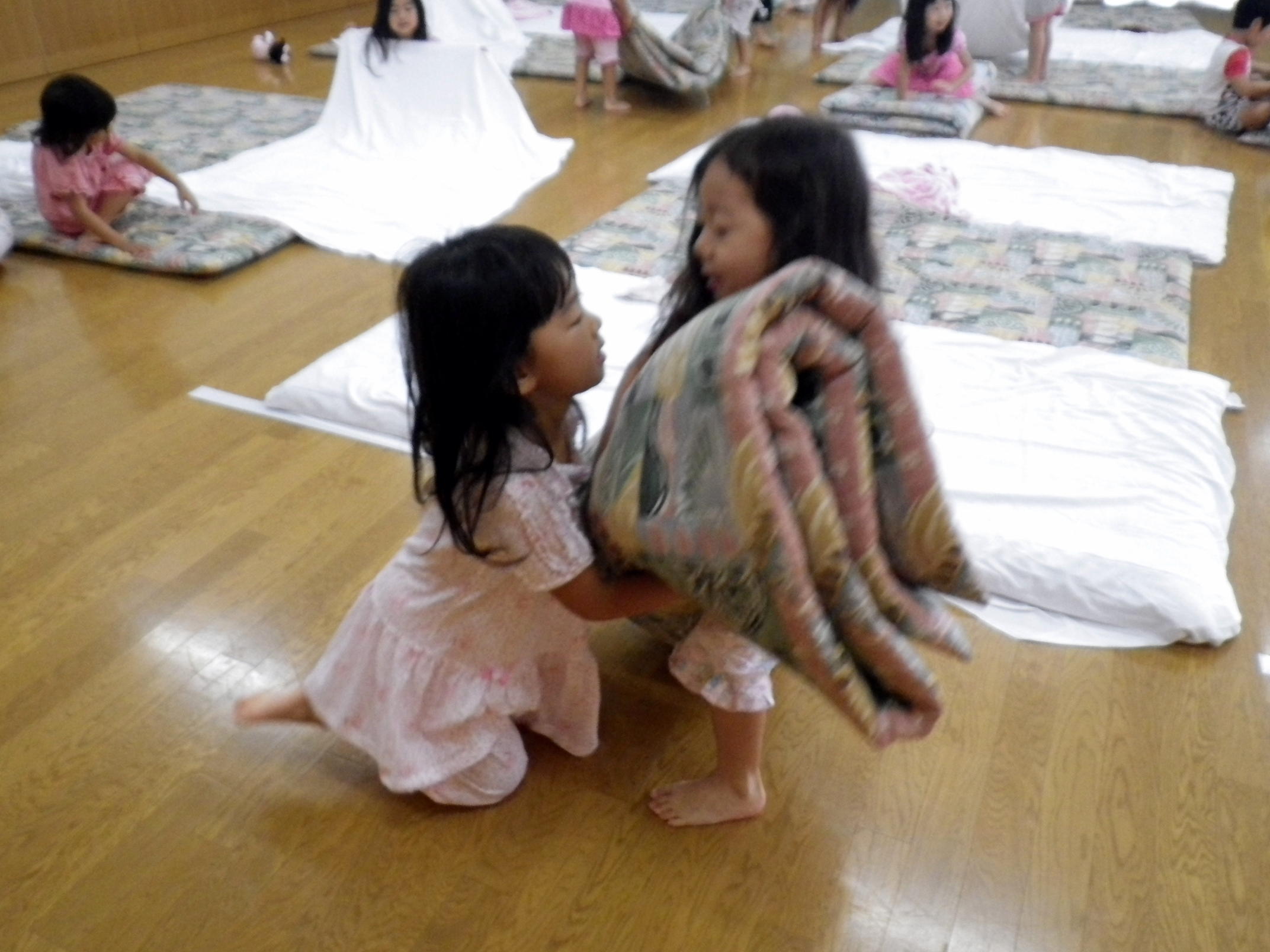 2012.07.13 動き始めましたよ!! 全学年共通 朝から みんな元気です。 まずは 眠っていたお布団の後片付けを頑張りました。 女の子たちは 先生方に髪をきれいに整えていただきましたよ。 そして おいし~い朝食! ギャラリー