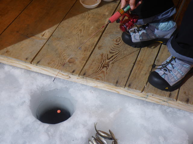 湖が凍ったら楽しめるあそび、それは「ワカサギ釣り」です。
