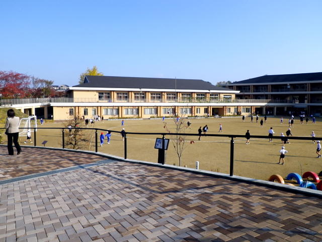近大付属小学校は、今年4月に東大阪から奈良近鉄、あやめいけに幼稚園、小学校共にキャンパスを全面移転されたんです。やはり、新しい校舎はいいですね。校舎全体は、木のぬくもりが感じられる造りでした。また、学校の入り口には完成途中ではあるものの、ビオトープもありました。大きな樹木もあり、自然の豊さが印象的でした。