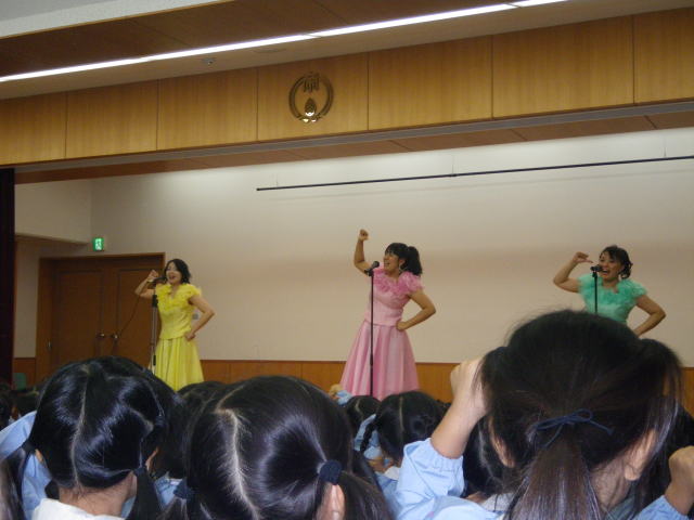 今日の芸術鑑賞会は、「SANTA☆MARIA」さんによる音楽コンサートでした。子どもたちは、どんな曲が聴けるのかとてもワクワクしていたようです。 また、今日は、未就園の小さなお友達も演奏を聴きに、たくさん来てくれていましたね(^-^) 音楽コンサートの一曲目は、今の季節にぴったりの♪秋のうたのメドレーから始まり、続いてリズム感のある♪怪獣のバラードを聴かせていただきました。その後は、子どもたちのよく知っている「となりのトトロ」の♪さんぽや、♪崖の上のポニョなどをみんなで一緒に歌い、元気な歌声がホールいっぱいに響きました。 オペレッタの「赤ずきんちゃん」では、オオカミさんが登場し、少しドキドキした子どももいたようです。 最後は、♪ミッキーマウスマーチの振り付けも教えてもらい、みんなで楽しい一時を過ごすことができました(^-^)