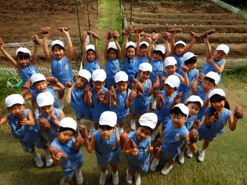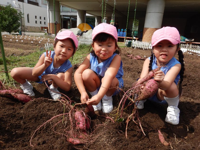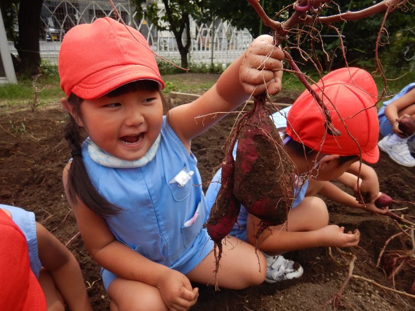 大きいのや小さいの、丸い形や細長い形などいろいろな重さや大きさ形を発見し、「面白い形のお芋見つけた!!」「こんなに大きいのがでてきたよ!」と喜びいっぱい嬉しさいっぱいで、芋掘りを楽しみました。