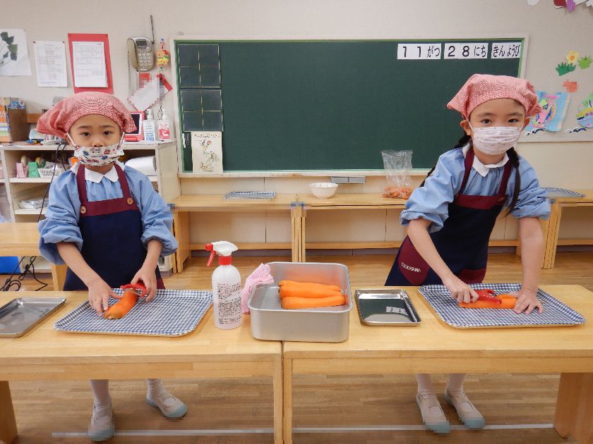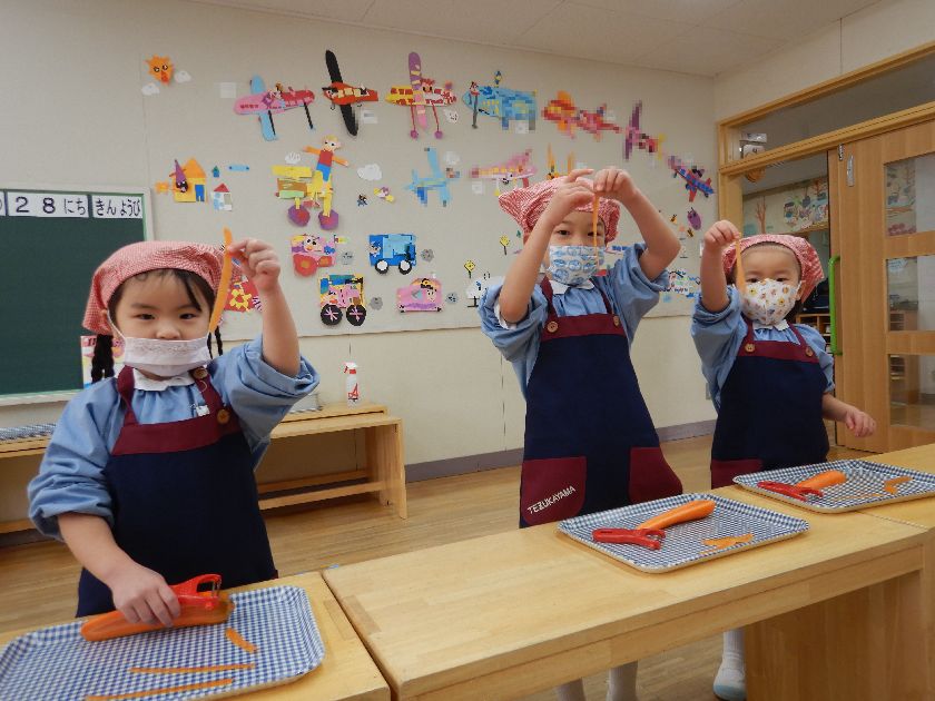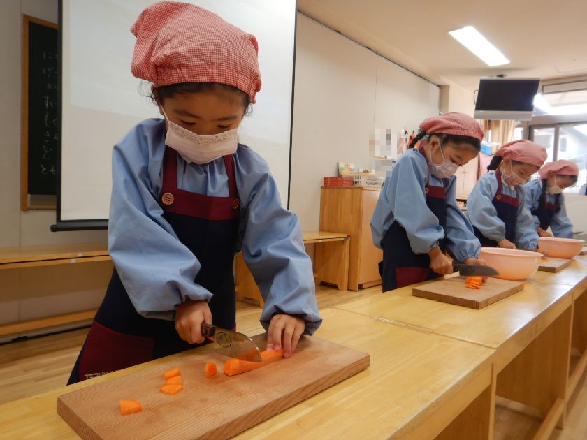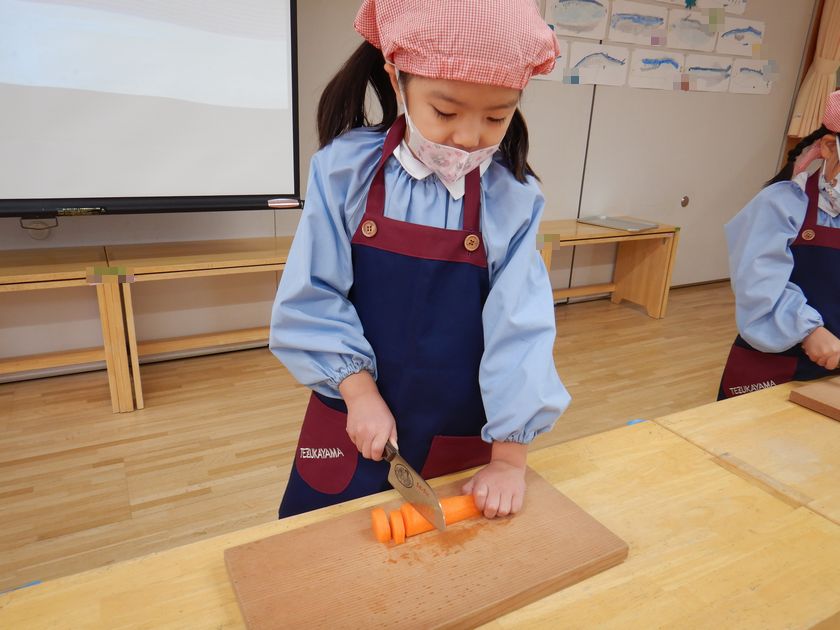 にんじんを包丁で切りましたよ!!お家での練習の成果が現れていました!みんなリズミカルに「とんとんとん」と切って見事にきれいな「いちょう切り」に仕上げてくれました♪