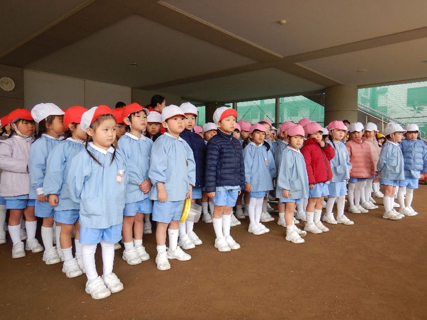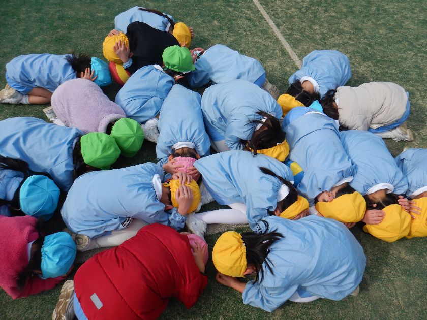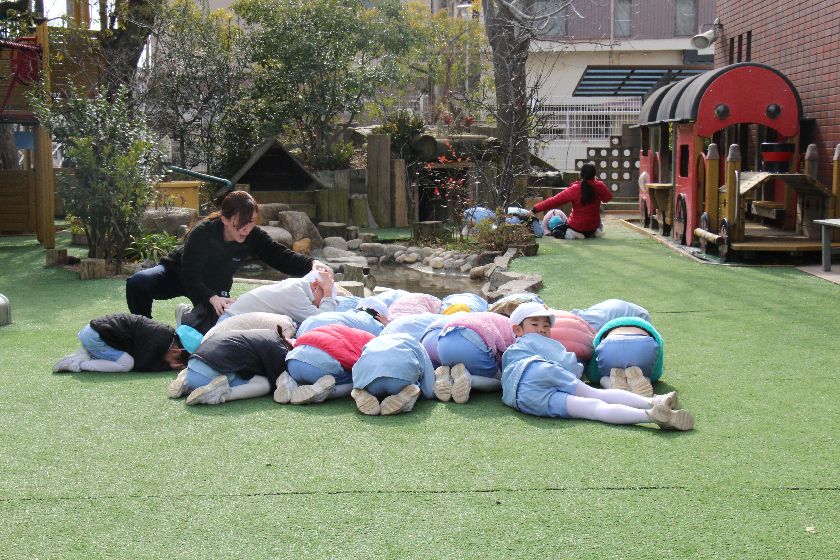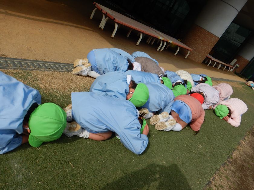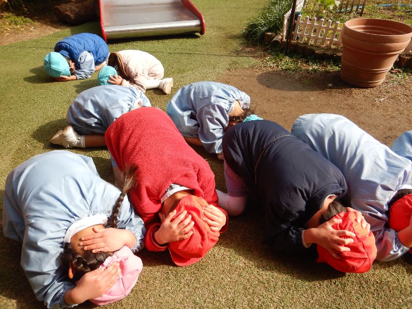 戸外では、近くに担任の先生がいなくてもすぐそばにいる先生の言うことをよく聞き、広い場所でダンゴムシポーズをして身を守ります。