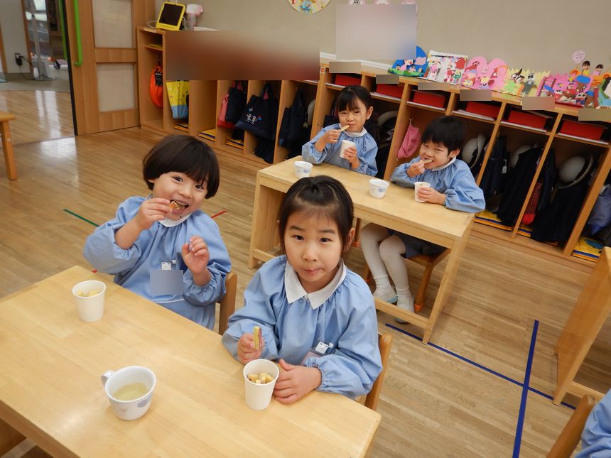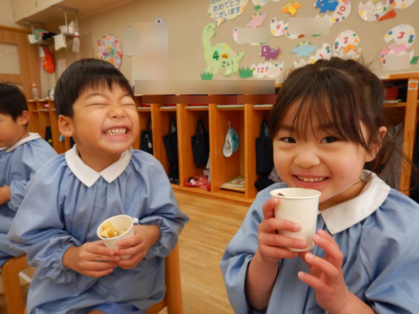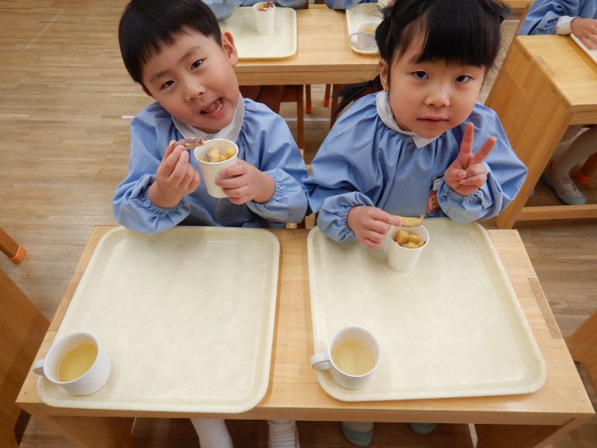 「さつまいものおやつでーす!!」と保育室にやってきた園長先生とさつまいものおやつに大喜び!