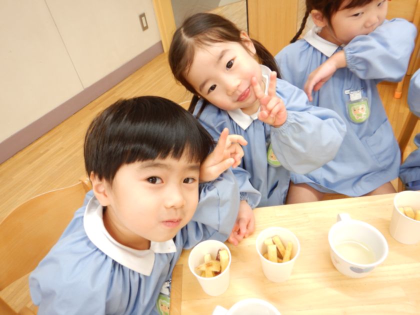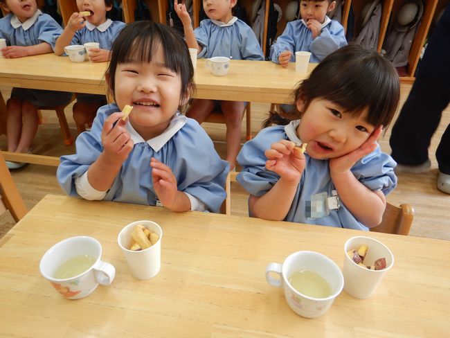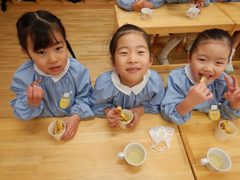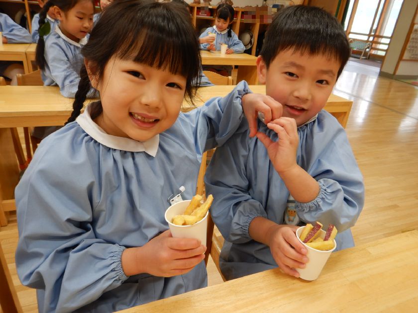 揚げたてのさつまいもとお砂糖の甘い香りが保育室いっぱいに広がります。