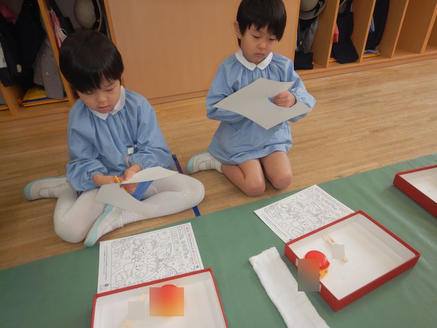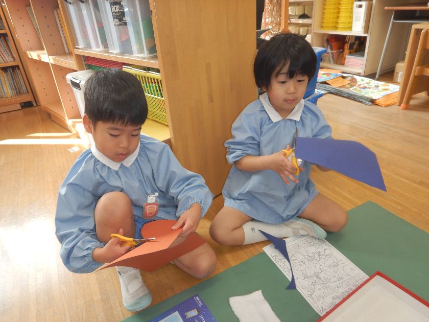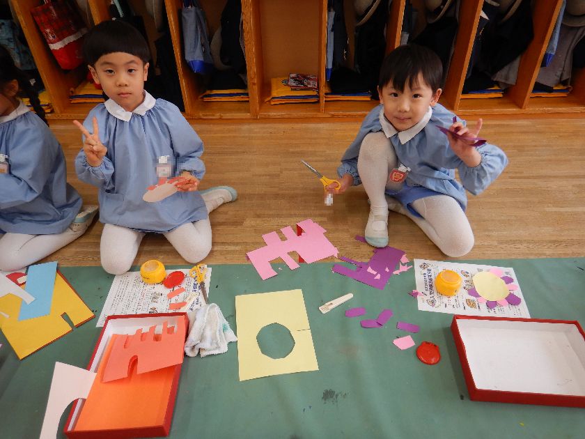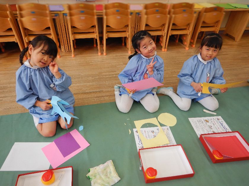 お花を作る人は赤組に、鳥を作る人は桃組にお引越しをして、2クラス合同での制作活動を楽しみました^^