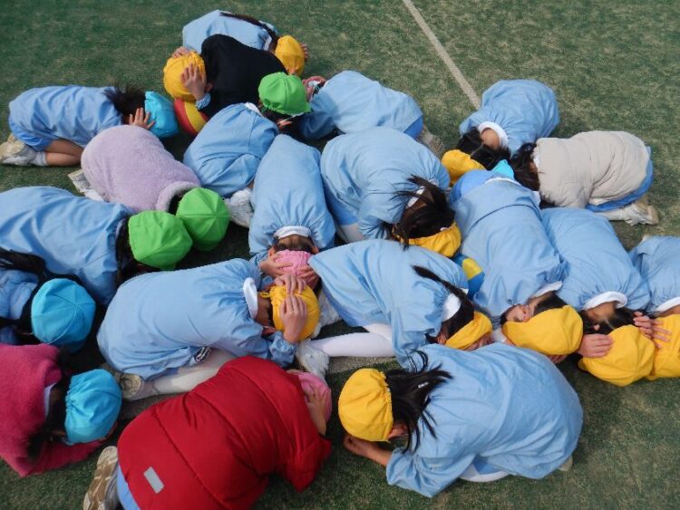 本日、戸外での地震を想定した避難訓練を行いました。 戸外では、近くに担任の先生がいなくてもすぐそばにいる先生の言うことをよく聞き、広い場所でダンゴムシポーズをして身を守ります。 地震の時には、「おさない」「はしらない」「しゃべ…