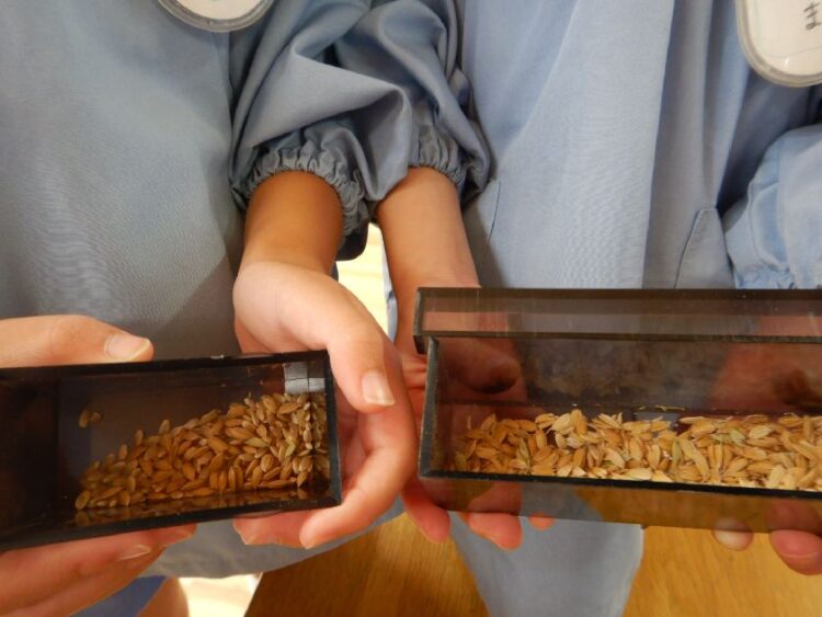 もみすり機 みんなの育ててきた大切な稲が、白米になるまでもう少し!!今日はもみすり機を使いました!脱穀をした稲穂を、もみ殻と玄米に分ける機械です。機械の中を見て「すごーい!」「落ちてきたよ!」と嬉しそうな子ども達でした。さぁ、次はこ…