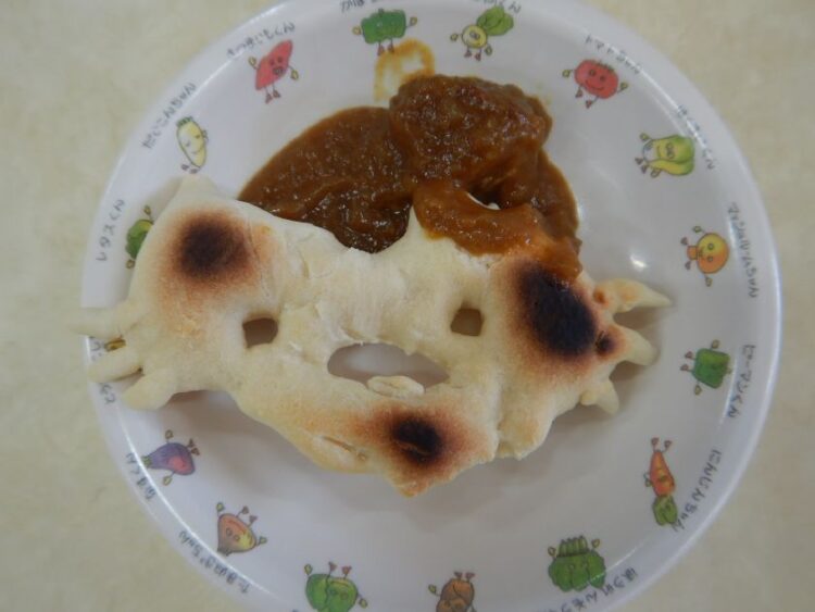 ナン作りに挑戦! 年長組はにんじんのカットの後、ナン作りに挑戦しました♪お粉と油と水を混ぜるだけ!ちょちょいのちょいっとこねあげて成形して焼きました。手先の器用な年長さんは上手に成形してくれました♪焼き上がりはもっちもちのふわふわで…