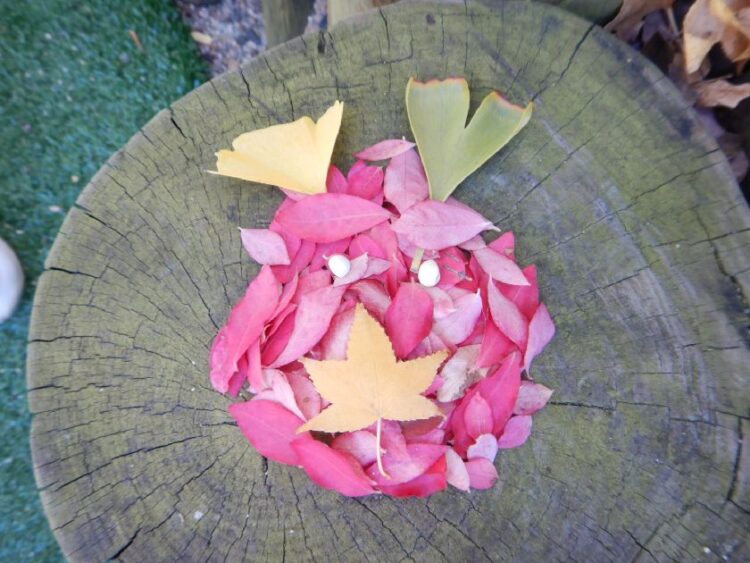 戸外遊びでは各々好きな遊びに没頭しています。テニスコートでドッジボール遊びをしたり、園庭で落ち葉集めや木の実拾いをしたりしながら充実した時間を過ごしています。秋の園庭は紅葉した葉っぱが園庭を彩ってくれていますよ♪ 大きな葉…