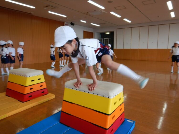 先日の体育教室では、跳び箱に挑戦しました。足をグーからパーにする、手を前につく、力強く飛ぶことを意識し何度もチャレンジする子ども達。かっこいい姿がたくさん見られました♪ いぇ~い! 走行から開脚跳び…