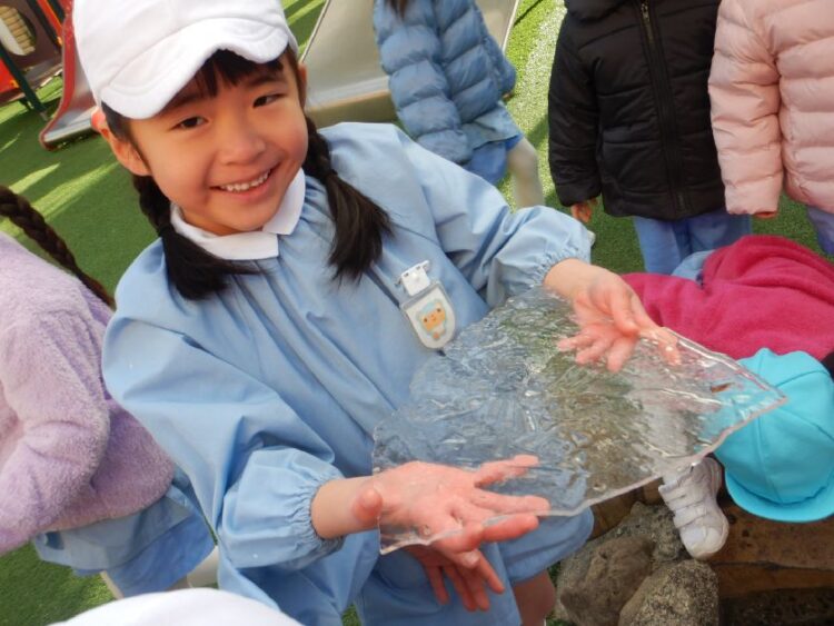 朝、登園する子ども達から「氷ができてるー!」と嬉しそうな声。蝶々門からお部屋までの間、どこかで見つけたようです。「早くお外遊び行きたい~!」「ジャブジャブ池にも氷ができてる!」「大きいの取れるかな~?」と期待が高まっている様子。戸外遊び中…
