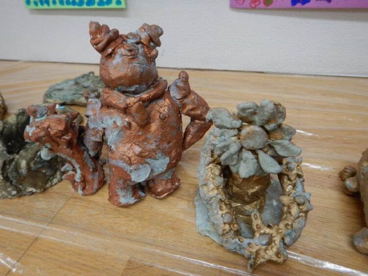 立体作品づくり☆紙粘土 作品展に向けて制作活動に意欲的に取り組んでくれている白組です。立体作品のテーマは「魔法の洞窟に入ると何かを発見!!」ということでそれぞれの想像力を働かせ発見した物を紙粘土で表現してみました。手先を器用に使って…