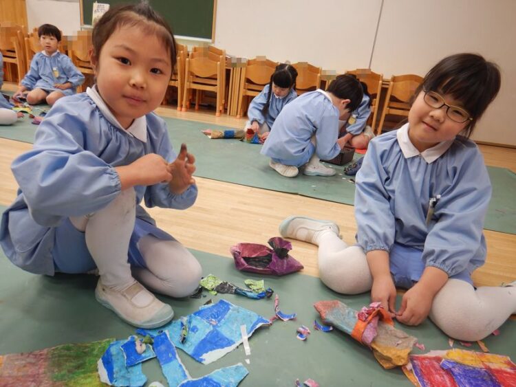 黄組の平面画ではタイルを使っての挑戦です!グループに分かれて色を塗り、エタノール液でにじませます。子ども達からは「うわ~!にじんでくる~!」「おもしろい~!」の声。そしてその後、かなづちを使って粉砕!「割っていいの!?」「たのしい!」「パ…
