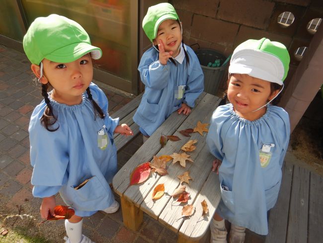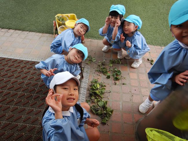 自分で実を割って白い種を取り出している年長さんの側で真似っこ♪