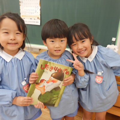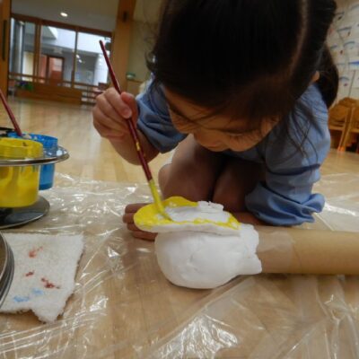 自分で実を割って白い種を取り出している年長さんの側で真似っこ♪