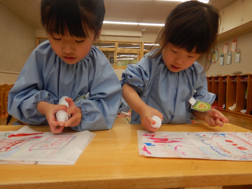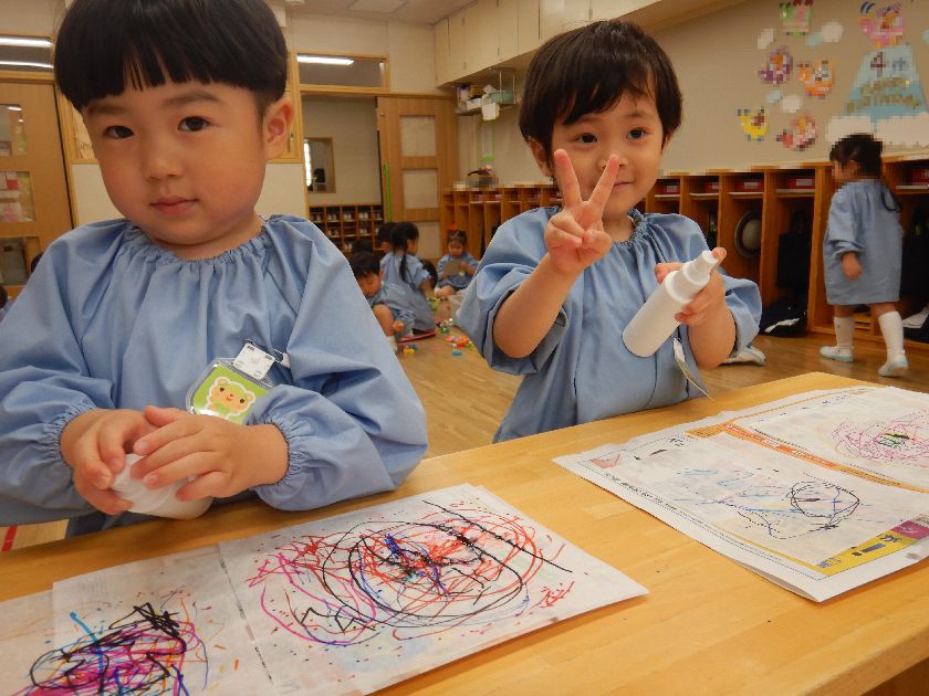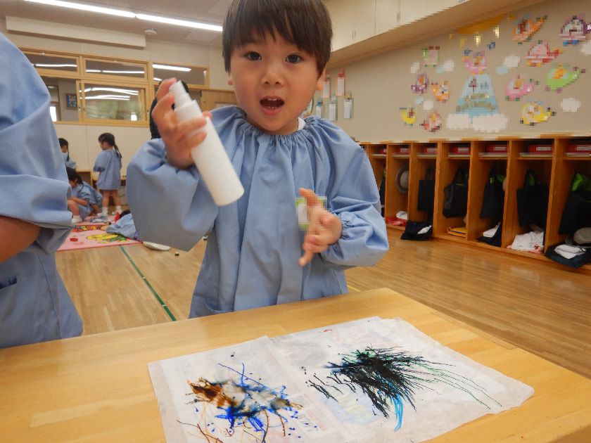 2026.04.21 こいのぼり制作② 年少組 昨日、和紙にマーカーでお絵描きをしたものに なんと今日は霧吹きで水をかけました! 描いていた絵や線に水がかかるとあら不思議! だんだんと色がにじんで形が変わっていく様子にみんなびっくり! 驚きながら楽しんで取り組めました。 さあ次はどんなことをするでしょう?お楽しみにしていてくださいね☆