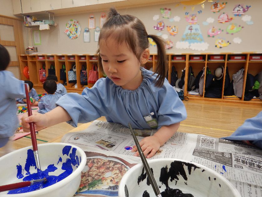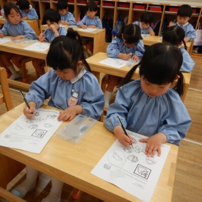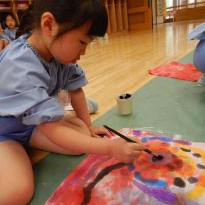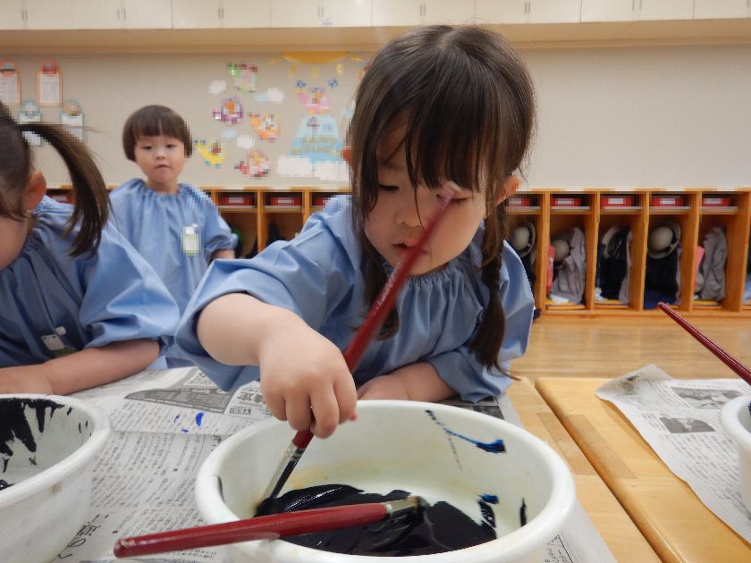 2026.04.22 こいのぼり制作③ 年少組 本日はこいのぼりの目を作りました! 今日使用したのは絵の具です! 以前は手に塗って手型をしましたが、今日は「筆」を使いましたよ。 小さな丸い画用紙に筆でポンってするだけであっという間に目のできあがり! 昨日つくったこいのぼりに早くつけてあげたいですね。 「こいのぼり」のうたも少しずつ覚え楽しく歌う歌声も聞こえてきますよ♪ 明日もお楽しみに!☆