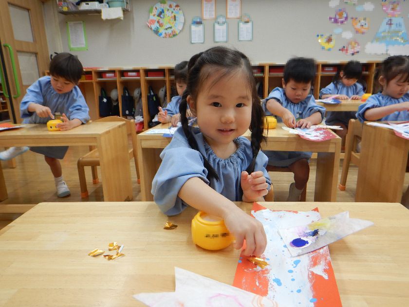 今日はみんなが絵の具で描いた川を、キラキラの金色の折り紙で彩りました。