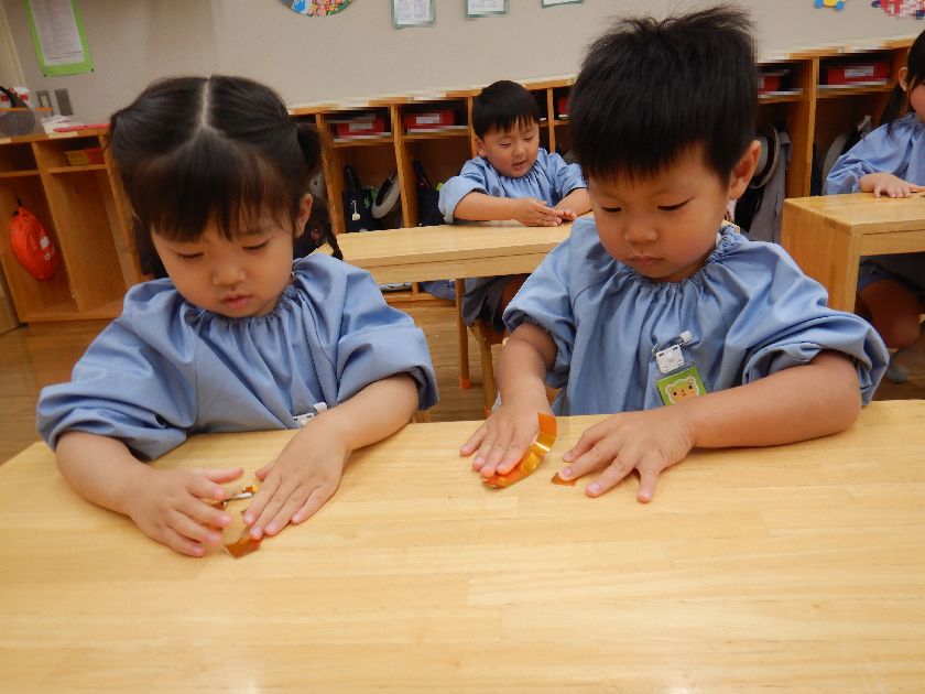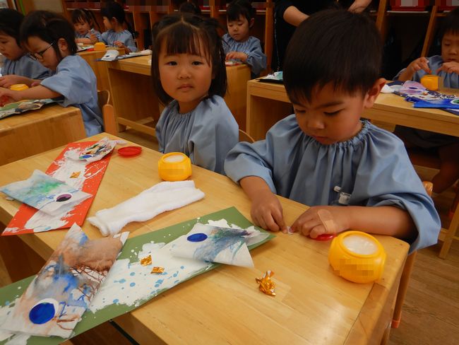 折り紙を指でちぎり、それをのりを使って貼っていきます。