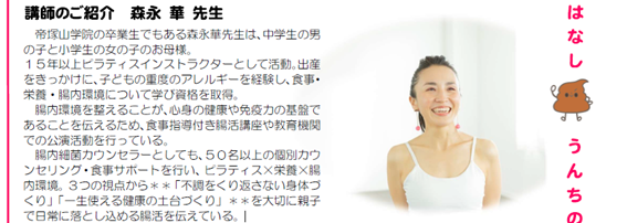 帝塚山学院の卒業生でもある森永華先生は、中学生の男の子と小学生の女の子のお母様。15年以上ピラティスインストラクターとして活動。出産をきっかけに、子どもの重度のアレルギーを経験し、食事・栄養・腸内環境について学び資格を取得。腸内環境を整えることが、心身の健康や免疫力の基盤であることを伝えるため、食事指導付き腸活講座や教育機関での公演活動を行っている。 腸内細菌カウンセラーとしても、50名以上の個別カウンセリング・食事サポートを行い、ピラティス×栄養×腸内環境。3つの視点から**「不調をくり返さない身体づくり」「一生使える健康の土台づくり」**を大切に親子で日常に落とし込める腸活を伝えている。