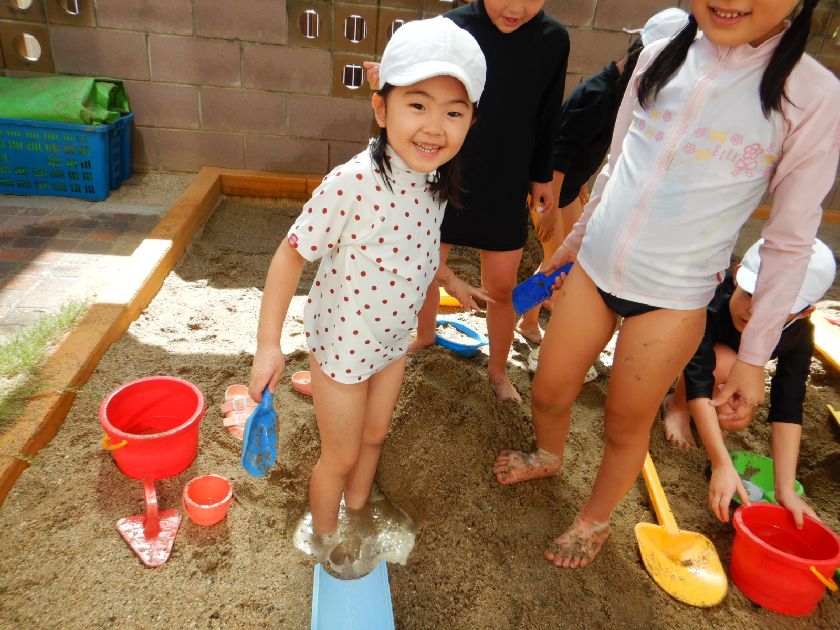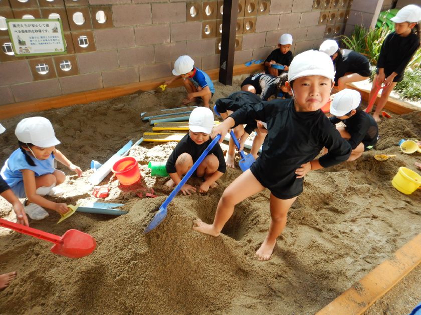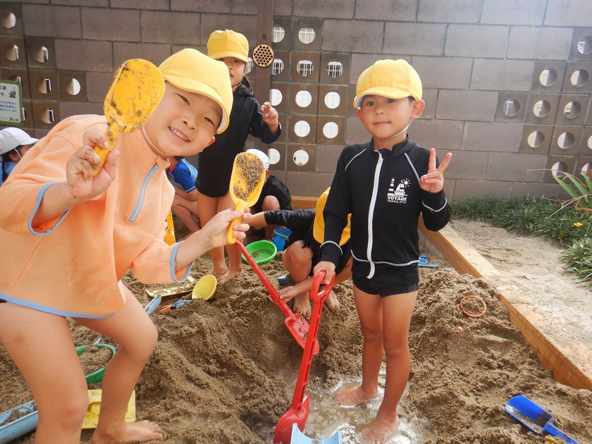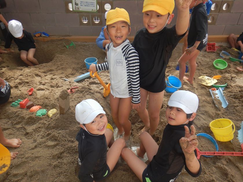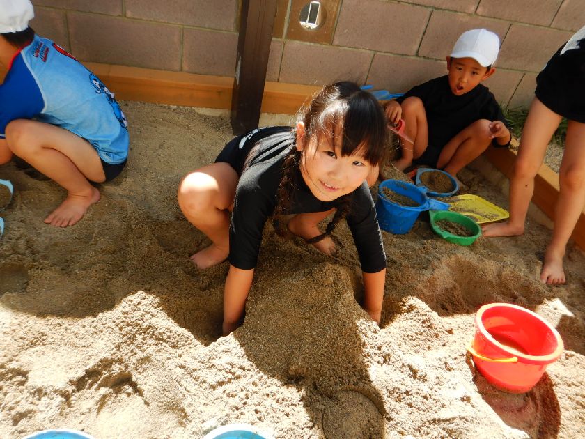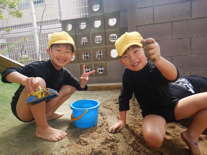 2025.09.24 ☆泥んこ遊び☆ 年長組 全身泥だらけ 学年合同で泥んこ遊びを楽しみました♪深い穴を掘って温泉にしたり足湯にしたりしながら泥の感触を味わいながら様々な物作りに挑戦しました!友達と協力して穴を掘る係、水を汲む係、上手に連携しながら遊んでいましたよ。自分達で遊びを進めていく様子はさすが年長組です!