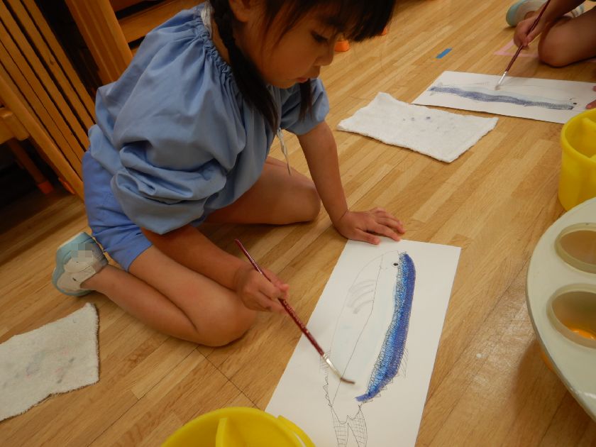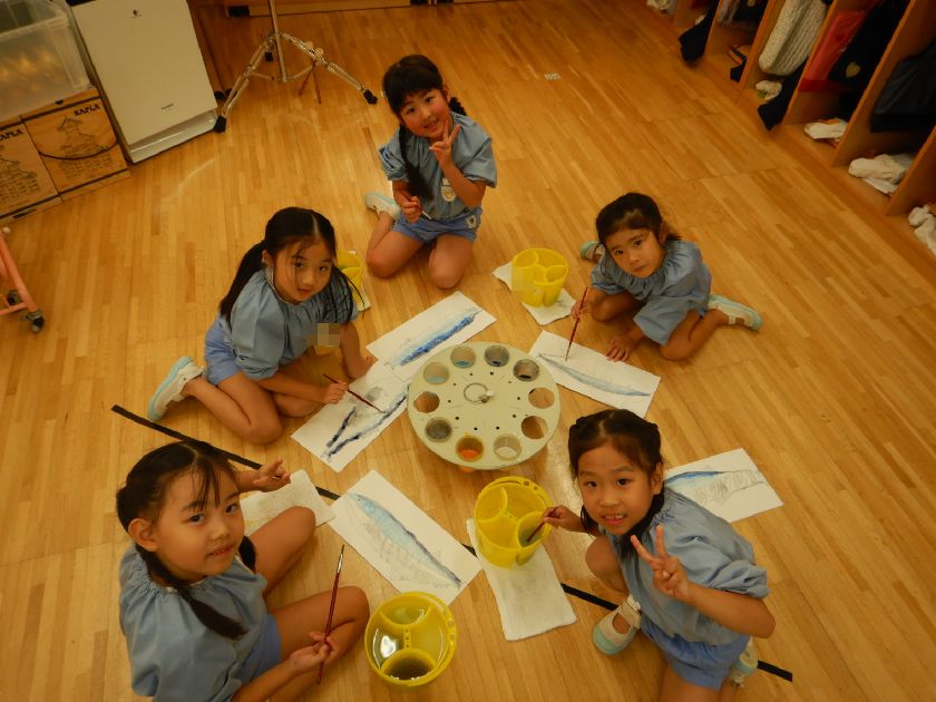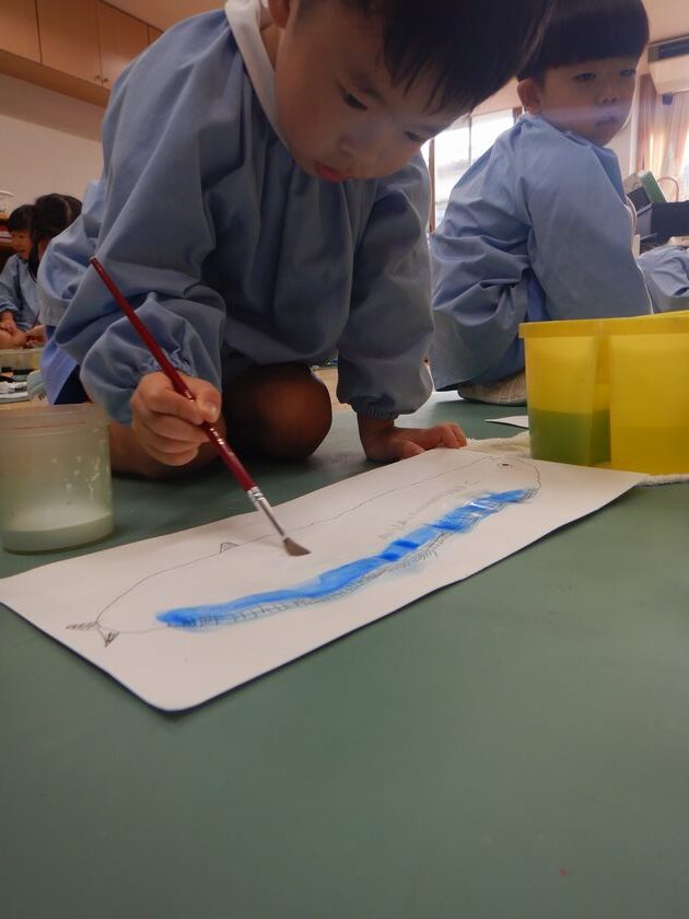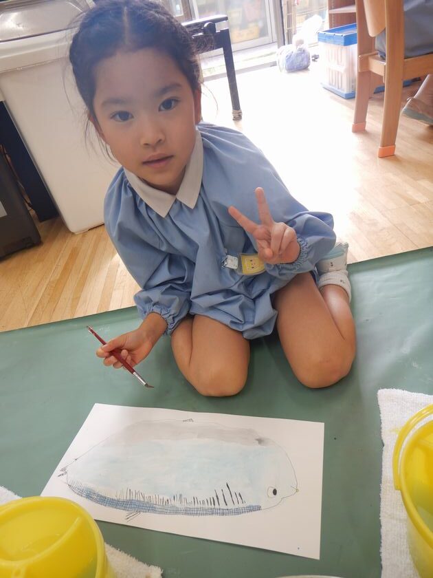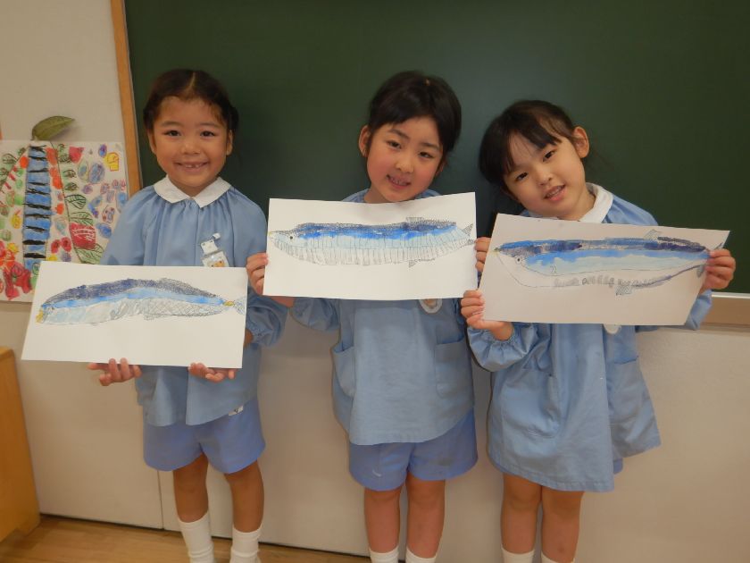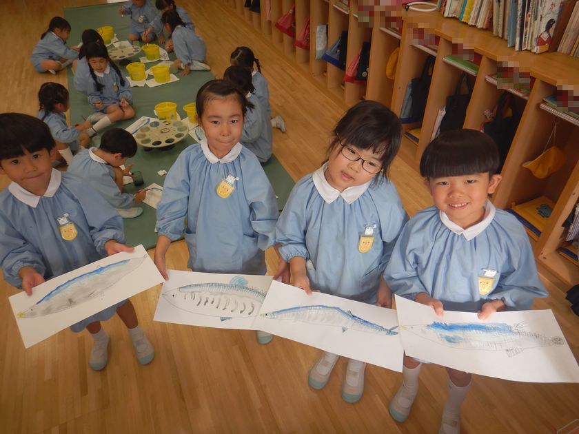 2025.10.24 絵画活動② 年長組 さんま☆観察画 ペンでデッサンした「さんま」に水彩絵の具で着色しました。今回のポイントはグラデーションに着色することです!細い筆を上手に扱い細かな部分を丁寧に仕上げました。保育室の壁面に展示しますので是非ご覧ください♪