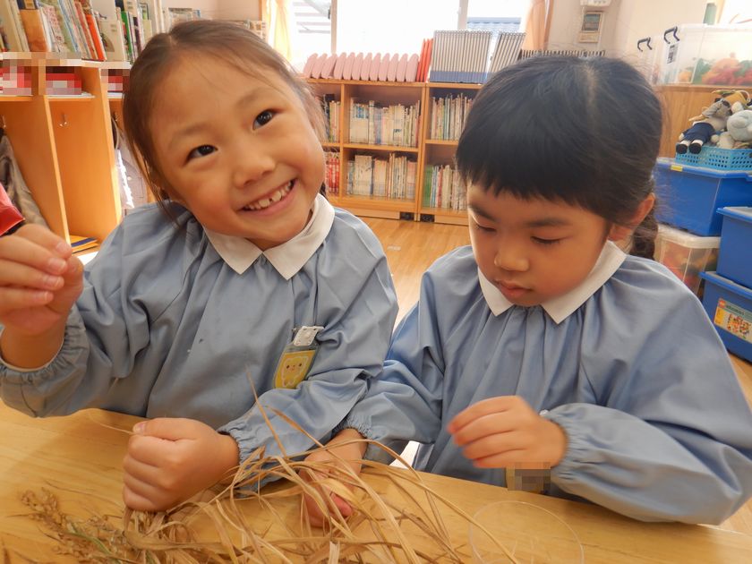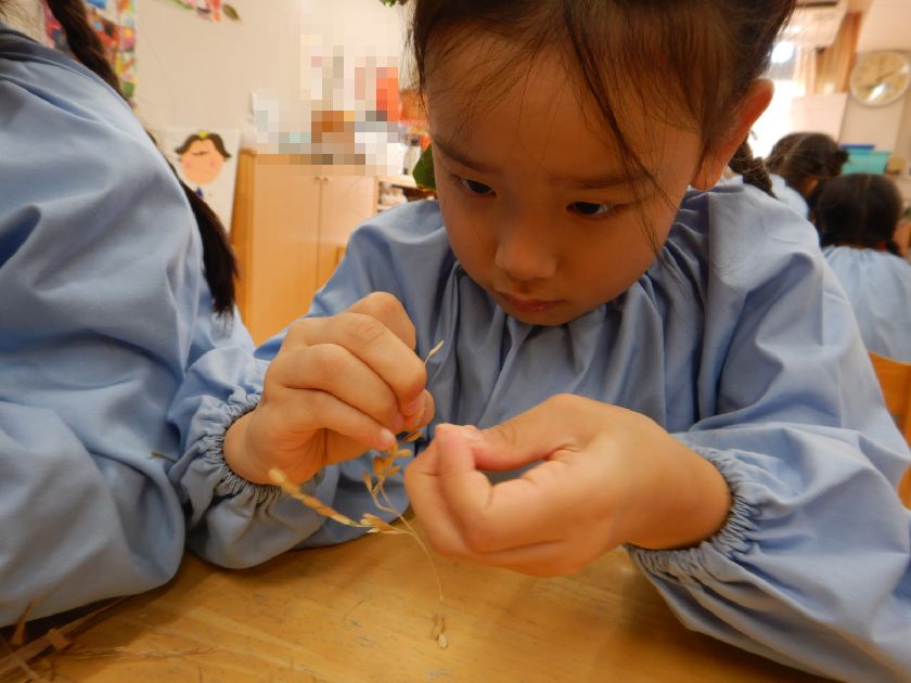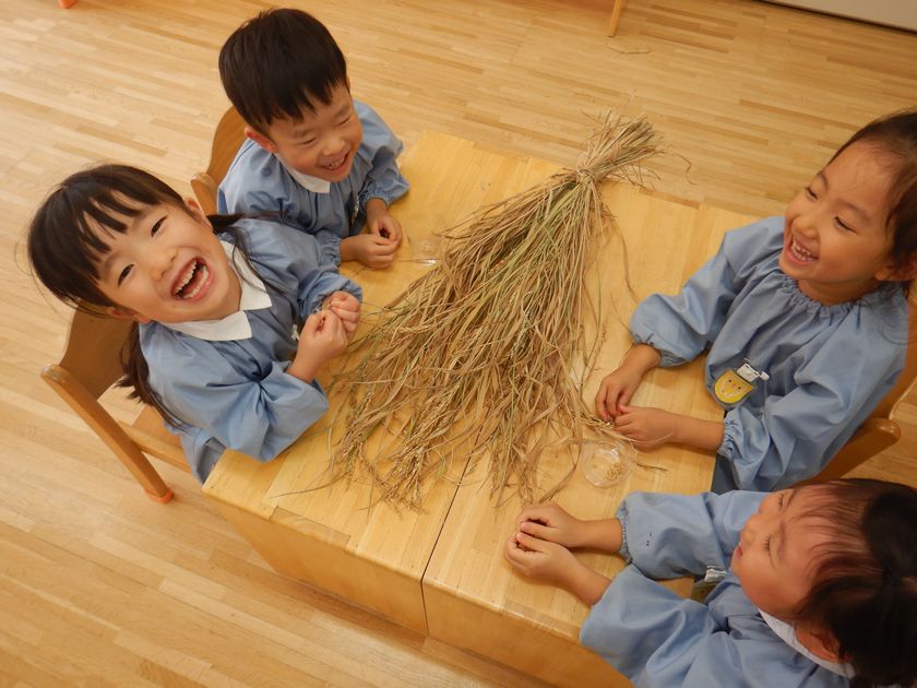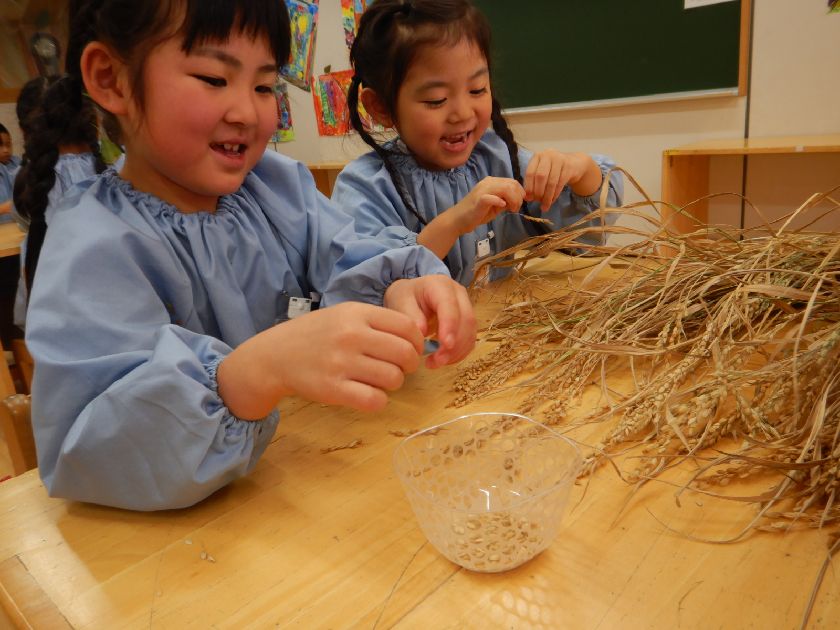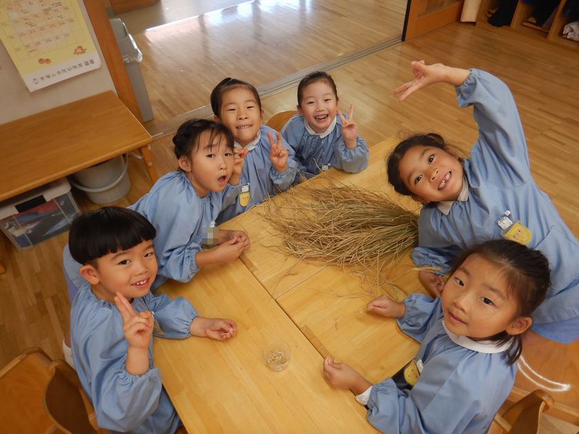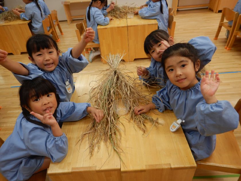 2025.10.27 日本のキラキラプロジェクト 年長組 脱穀をしました! 稲刈りの後、穂が下向きになるようにつるして干しました!そしてそこから10日間。乾燥させた稲を次は『脱穀』しましたよ♪たくさん実ったお米に感謝しながら、丁寧に少しずつ手で外しました。次はもみすり機と精米機にかけていきますよ~!お楽しみに!!