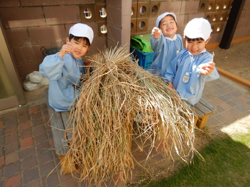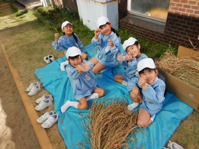 2025.10.30 ☆脱穀作業☆ 年長組 たわわに実ったお米 秋晴れのもと戸外遊び時に脱穀の続きをしました♪今年は本当に豊作でたわわに実ったので脱穀作業に大忙しです!!暖かい太陽の日差しの中、女子会のように色々なお話をしながら作業に取り組みました。みんな話が尽きないです…ずーーーっとおしゃべりしていました!! いい場所みーっけ♪ こちらはシートの上で