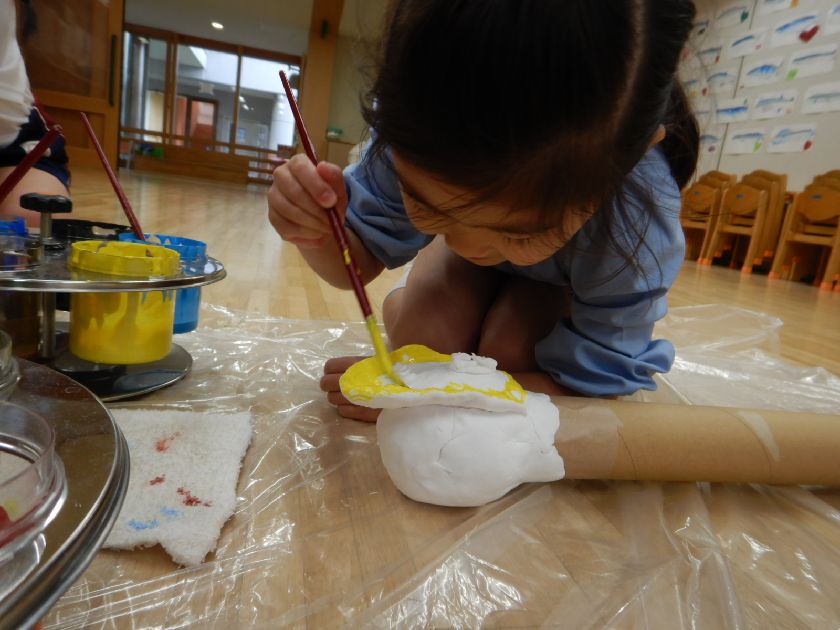 白組のミュージカル中で使用する小道具の制作に取り組みました!自分で使うものは自分で作る!年長だからこそ出来ることもたくさんあります。自分達で作り上げるミュージカルも終盤に差し掛かってきました!でも担任はギリギリまで「やっぱり変えよう!ん---。何か盛り上がりにかける…」など、日に日に変更あり!歌も増える!動きも増える!子ども達大変…!でも白組の子ども達は出来ないとは言わず実行してくれるんです!さすがです!!子ども達の練習の様子を見ていると感心することばかりです。本番まであとわずか…クラス一丸となって頑張るぞー!!おーーー!