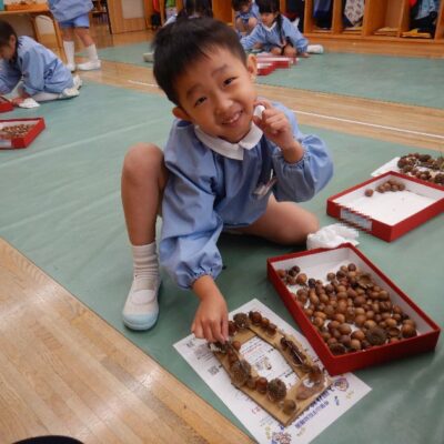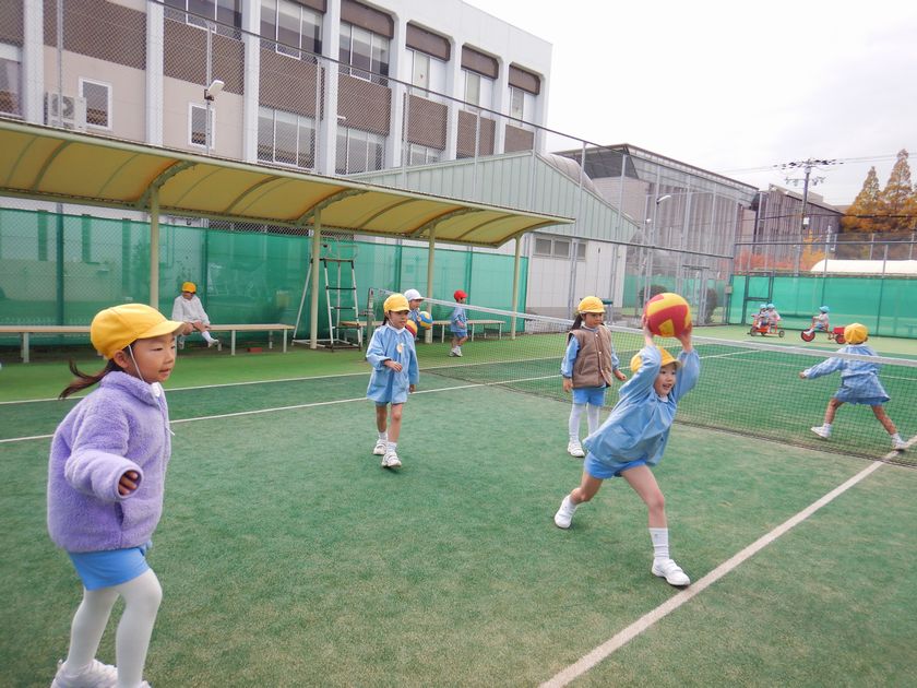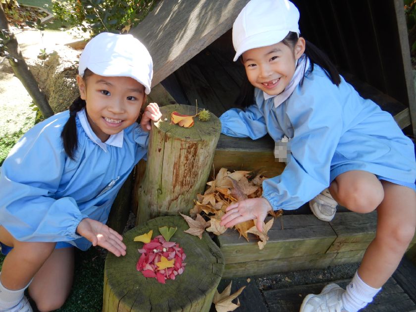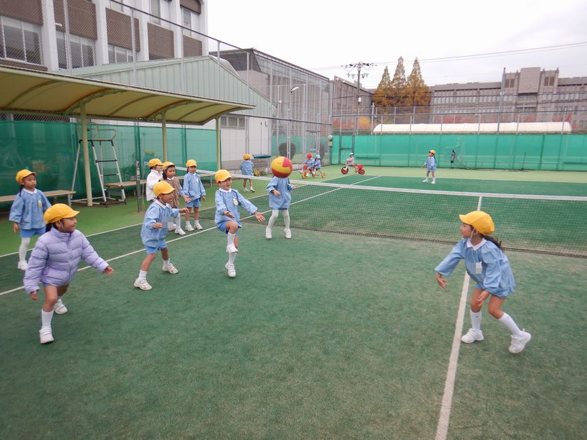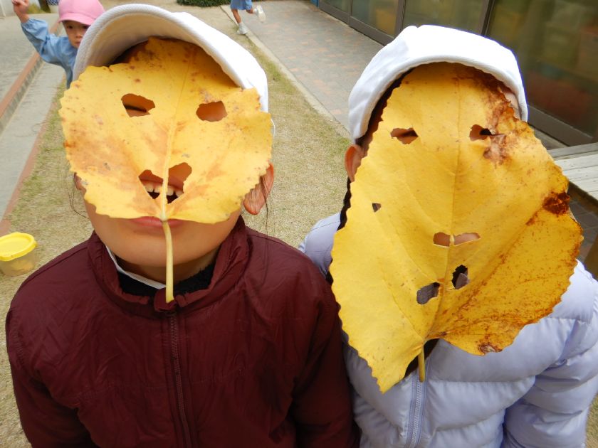 2025.11.27 年長☆戸外遊び 年長組 戸外遊びでは各々好きな遊びに没頭しています。テニスコートでドッジボール遊びをしたり、園庭で落ち葉集めや木の実拾いをしたりしながら充実した時間を過ごしています。秋の園庭は紅葉した葉っぱが園庭を彩ってくれていますよ♪ 大きな葉っぱで仮面 ドッジボールに夢中