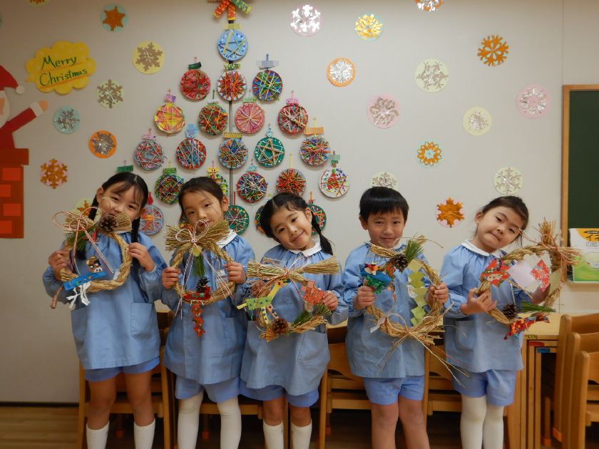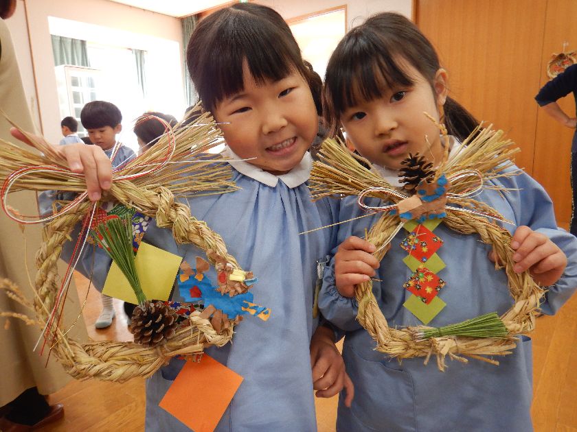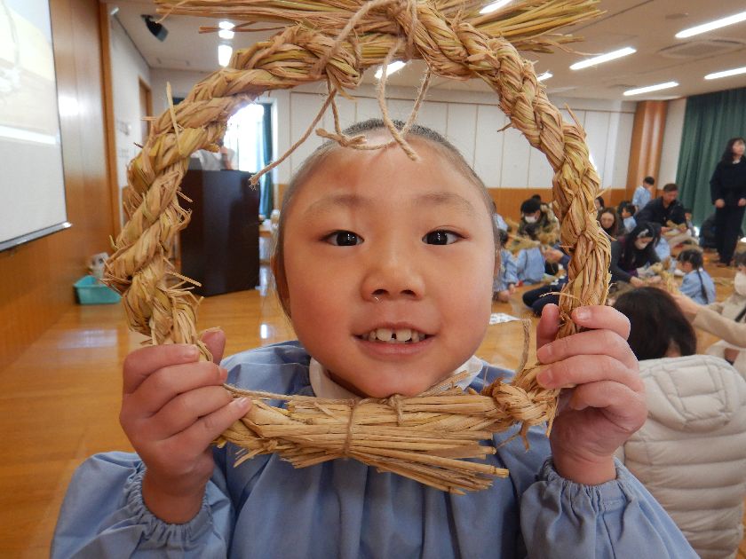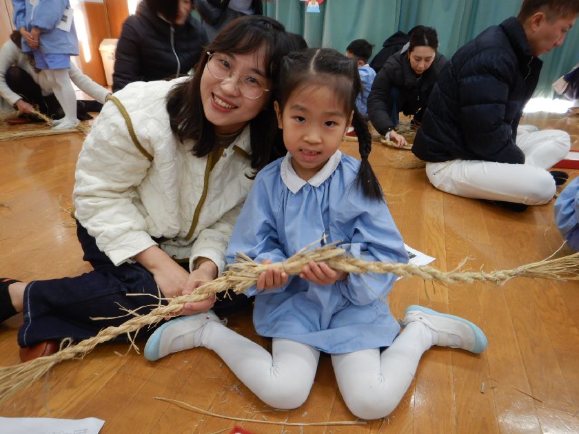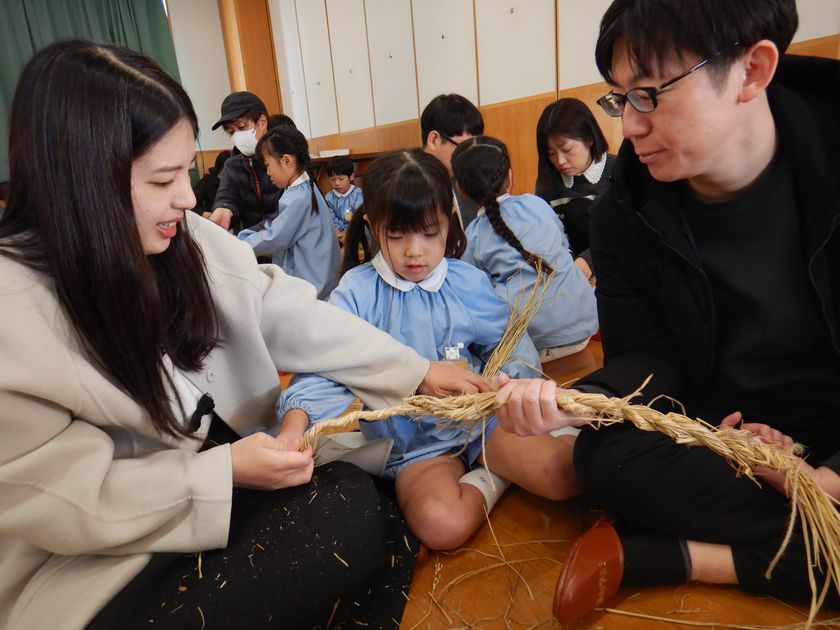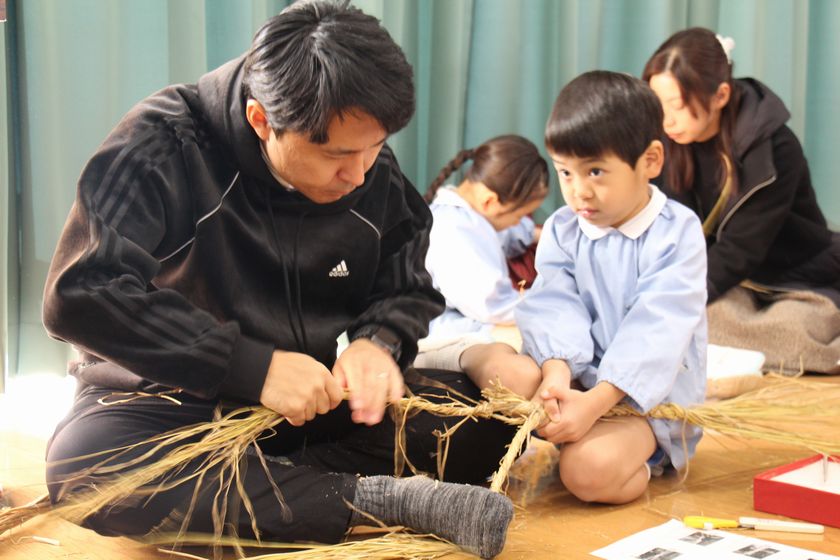 保育参観の続編です。お米を収穫した後に残った藁を使ってしめ縄リース作りに親子で挑戦しました。