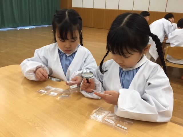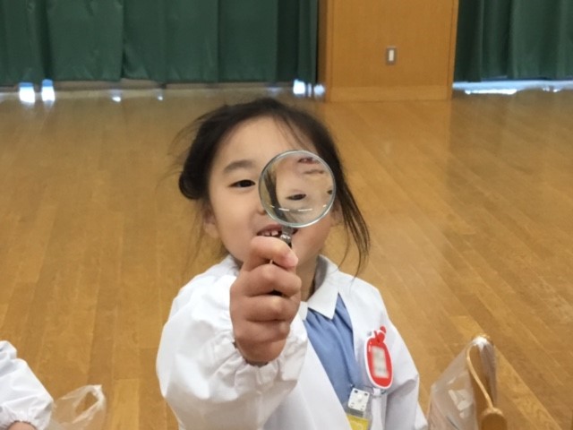 最初の実験は、「虫めがね」のふしぎです。前回も虫眼鏡で葉っぱを観察しましたね。今回は「結晶」を見てみよう!まずは、「しお」を虫眼鏡で観察すると・・・1つ1つの粒が「四角(サイコロの形)」をしていました!また「ミョウバン」の結晶の観察では、「ダイヤモンドみたい!」と歓声があがりました。他にも小さなイラストや文字を見たり、目から遠ざけてのぞくと逆さまに見えたり、いろいろな発見がありましたね。