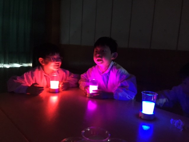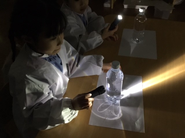 最後の実験は、「ミルクのマジック!?」です。光を水に当てると、光は水の中を通り抜けてしまい水は光りません。でも、そこにミルクを入れると・・・、あれ!?ビックリ!水の中に光が見えました!みんな「わぁすごい!」と夢中になって水が光るのを楽しんでいましたね。ぜひお家でも三色ライトで光のマジックを楽しんでくださいね! 次回のサイエンスラボクラブは2月6日(金)、テーマは“ばねっておもしろい”です。なんと、もう最終回です。次の実験もお楽しみに!