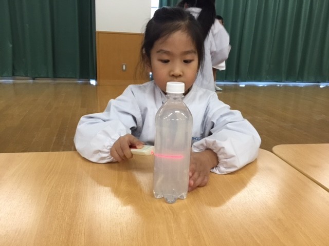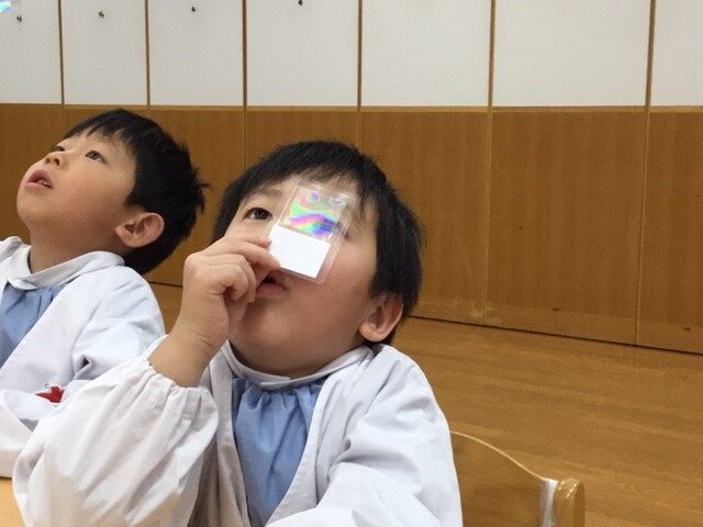 次の実験は、なんと「虹」を作ります!じつは簡単に虹を見ることができます!ペットボトルに入れた水に光を当てると虹ができました。虹を机にうつしたり、天井にうつしたり、とみんな大はしゃぎでしたね。さらにホログラムシートを通して光を見るととてもきれいな虹ができました。お家でもいろいろな光をホログラムシートでのぞいて、たくさんの虹を観察してくださいね。特に花火はおススメですよ!