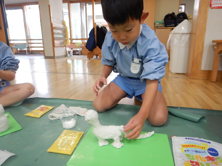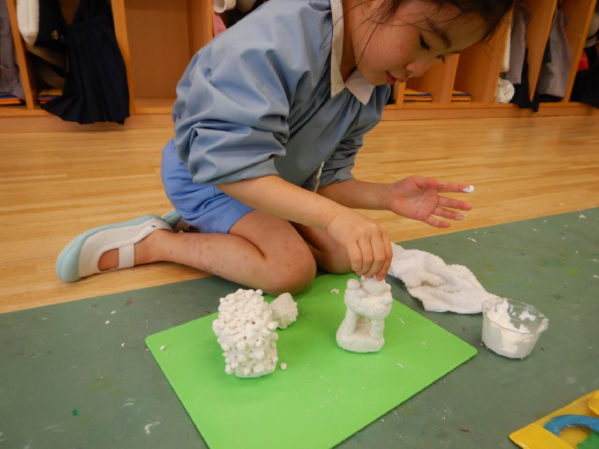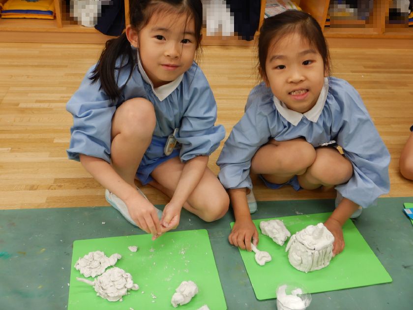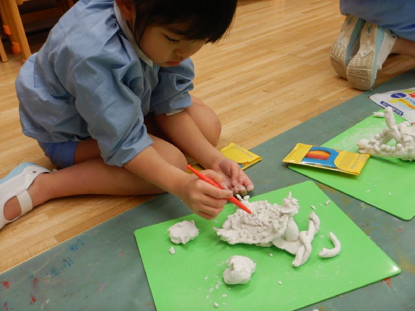 作品展に向けて制作活動に意欲的に取り組んでくれている白組です。立体作品のテーマは「魔法の洞窟に入ると何かを発見!!」ということでそれぞれの想像力を働かせ発見した物を紙粘土で表現してみました。手先を器用に使って丸めたりねじったり平らにしたり…様々な形作りに挑戦しています。どうすれば上手にくっつくかな?この形に作るにはどうすればよいかな?など頭をフル回転させながら集中して取り組んでいます!