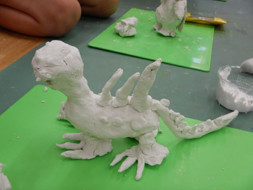 作品展に向けて制作活動に意欲的に取り組んでくれている白組です。立体作品のテーマは「魔法の洞窟に入ると何かを発見!!」ということでそれぞれの想像力を働かせ発見した物を紙粘土で表現してみました。手先を器用に使って丸めたりねじったり平らにしたり…様々な形作りに挑戦しています。どうすれば上手にくっつくかな?この形に作るにはどうすればよいかな?など頭をフル回転させながら集中して取り組んでいます!